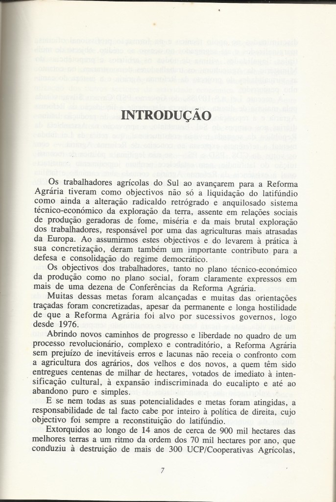 “3 % do total das explorações agrícolas, ou seja, 2600, têm mais terra do que 780 000 explorações,mais terra do que 97% do total dessas explorações agrícolas!No Sul de Portugal estão situadas as maiores herdades da Europa capitalista, como, por exemplo, as herdades de Palma (16 000 ha), Comporta (29 000 ha), Rio Frio (17 000 ha), Machados (6000 ha), Companhia das Lezírias (mais de 30 000 ha), Casa Cadaval (15 000 ha), etc., e muitas outras, na sua maioria incultas ou mal aproveitadas. Na opinião do PCP não haverá em Portugal uma só reforma agrária, mas, digamos, duas reformas agrárias.Na zona da grande propriedade a reforma agrária passa pela expropriação dos latifundiários e das grandes explorações agrícolas capitalistas.”