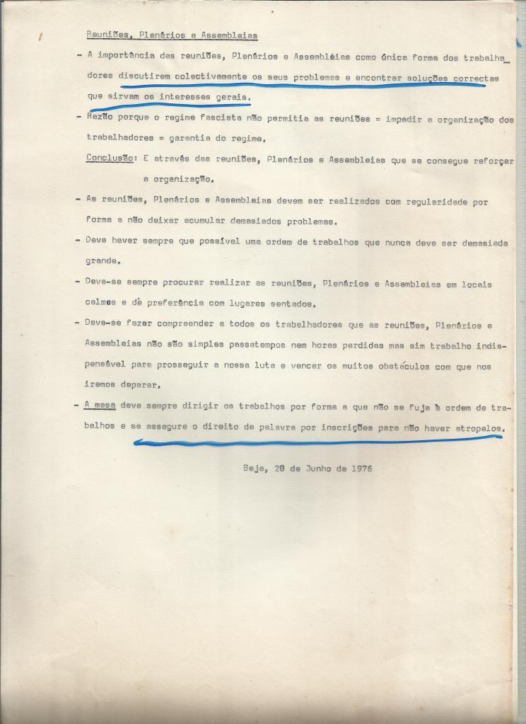 O documento “PONTOS ESSENCIAIS PARA O AVANÇO DAS UNIDADES”, (leia-se UCP.s) que em seguida se publica é um documento produzido pela Direcção do Sindicato dos Trabalhadores Agrícolas do Distrito de Beja, a 28.6.1976, destinado a servir de orientação aos Delegados Sindicais na sua relação com as UCPs e com os trabalhadores das mesmas.